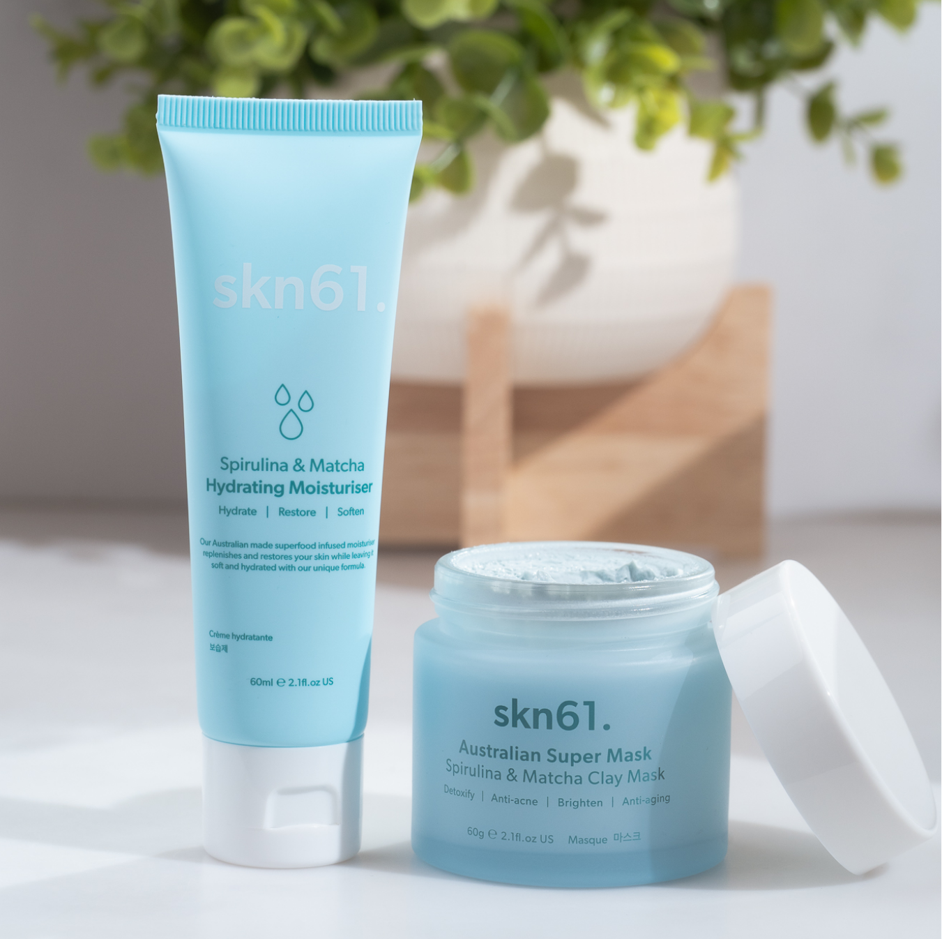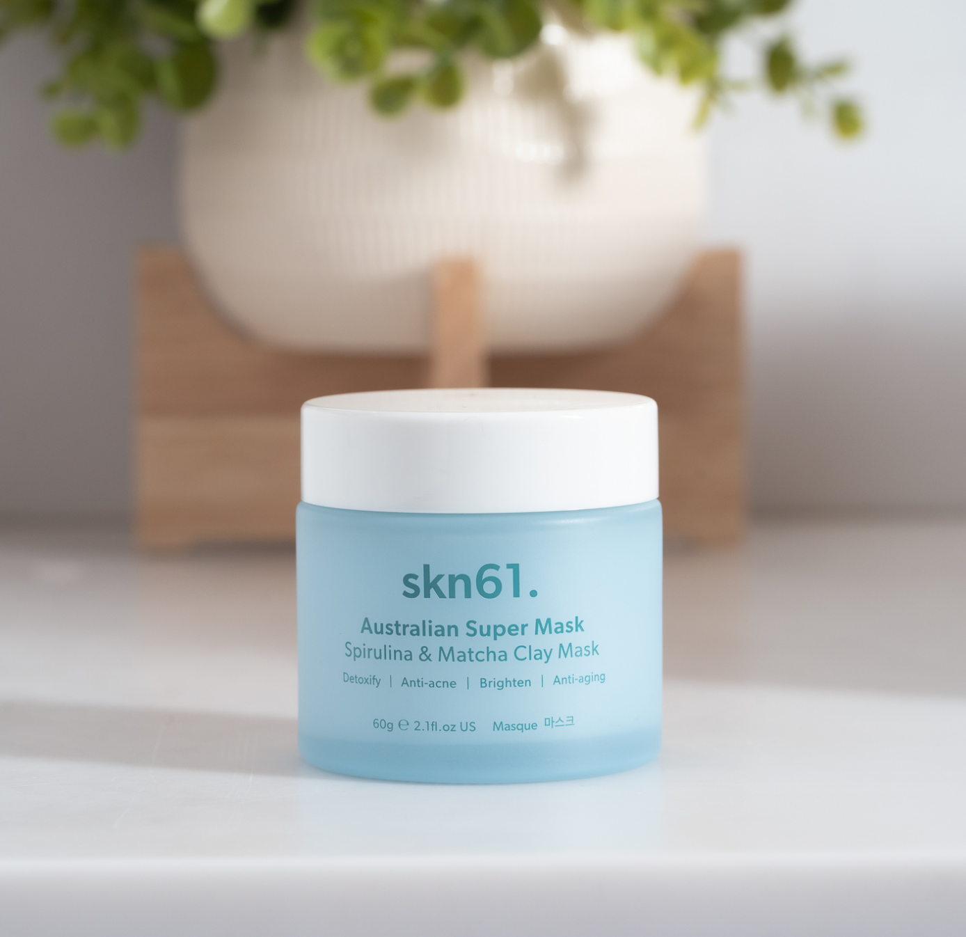 Our skn61 SuperMask combines two of the most powerful superfoods in the world, Spirulina & Matcha into one all natural clay mask that draws out impurities, minimises pores without irritation.